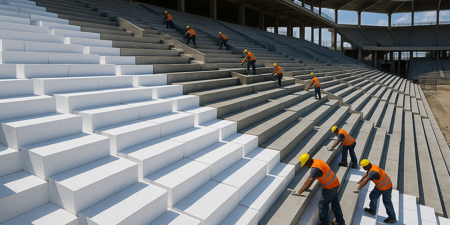 - Compatible with Load-Bearing Flooring Systems Whether used beneath precast seating panels, poured concrete steps, or steel framing systems, Geofoam accommodates live and dead loads without deformation—ensuring audience safety and comfort.